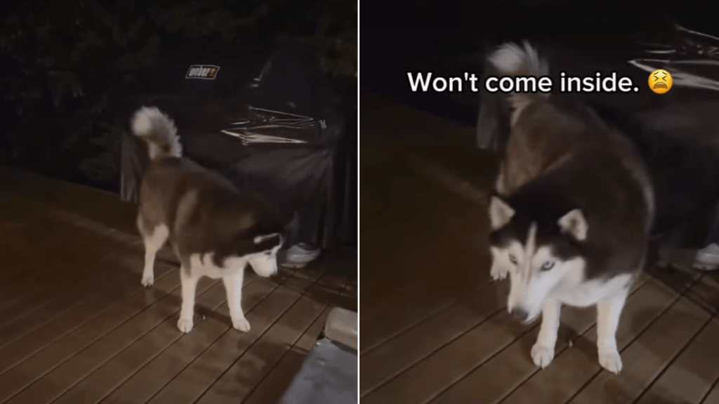 Quarter to four in the morning is prime deep sleep time for most people, but Archer operates on his own clock. On the @siberianderpskies Instagram page, this black and white Husky is seen standing in the pouring rain on a dark patio. He refuses to come inside, forcing his exhausted dad to investigate the 3:45 AM commotion. While his sister Leia was likely cozy inside, Archer stayed out to bark up a storm. He decided he needed a specific toy to sleep and that simply could not wait until sunrise.