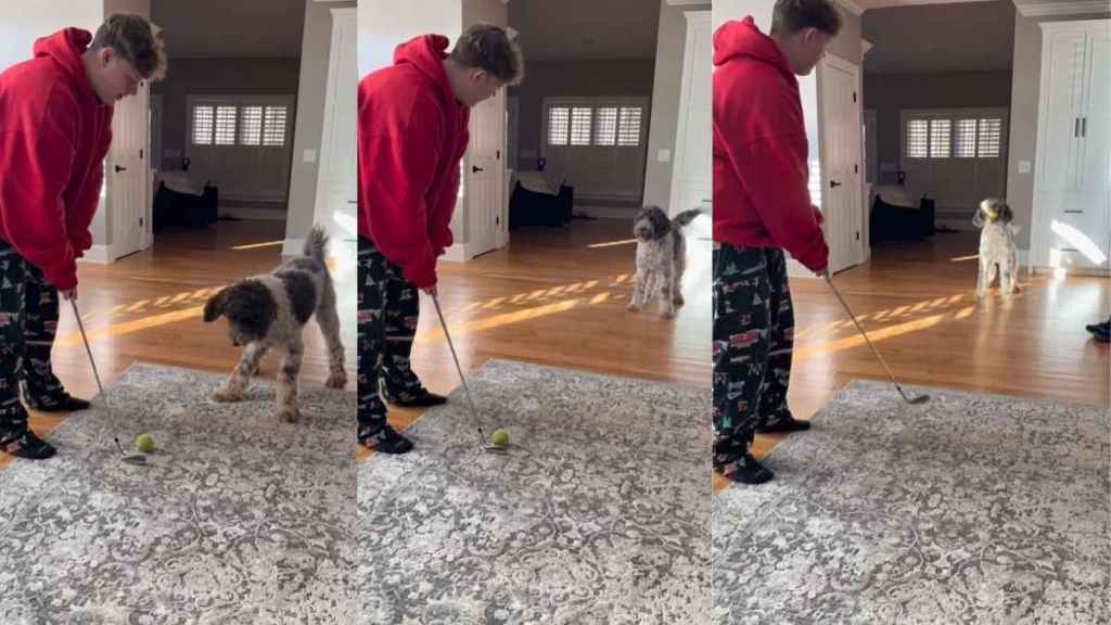 Playing with a ball inside the house usually means a quick toss across the rug. But Poppy isn’t interested in the standard rules of the game. There is a gold club involved. Her owner, @destiney_watt, shared a video of the dog taking fetch to a whole new level. Poppy is a sweet Doodle who apparently does it all. She stands on the hardwood floor and waits for her human to take a swing. Her excitement and anticipation are contagious. She is clearly a pro at being a golf assistant.
