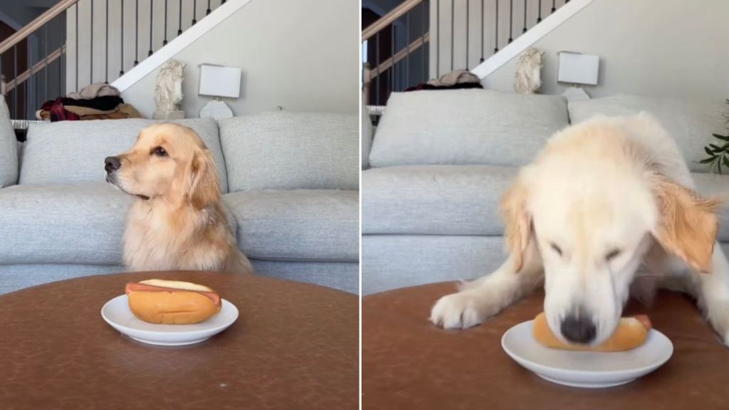 After the dad leaves the room, that’s when Maverick starts to struggle. You can see the conflict in his eyes. He looks at the hot dog, then looks away. He tries to be strong, but the smell is just too good. The dog puts a paw on the table, he checks to see if anyone is looking, and then he just goes for it. Maverick snags the whole thing, first hesitantly, then wholly. “Where did my hotdog go?” his dad asks, entering the frame again. But the Golden Retriever is already gone. He is busy finishing “his” hot dog.