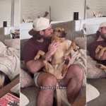 The video’s on-screen caption explains, “Things my pitbull that was raised by cats does daily.” In the caption, Opie’s owner adds, “That’s what Happens when you’re raised by 6 cats” — and what happens is that the dog lives a lifestyle of a cat.